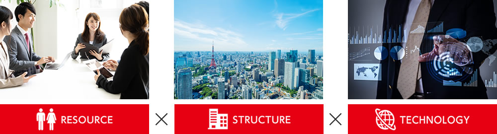 We will maximize business value of clients with multiplication of “RESOURCE(HR)”, “STRUCTURE(Property)”, and “TECHNOLOGY(IT)”.